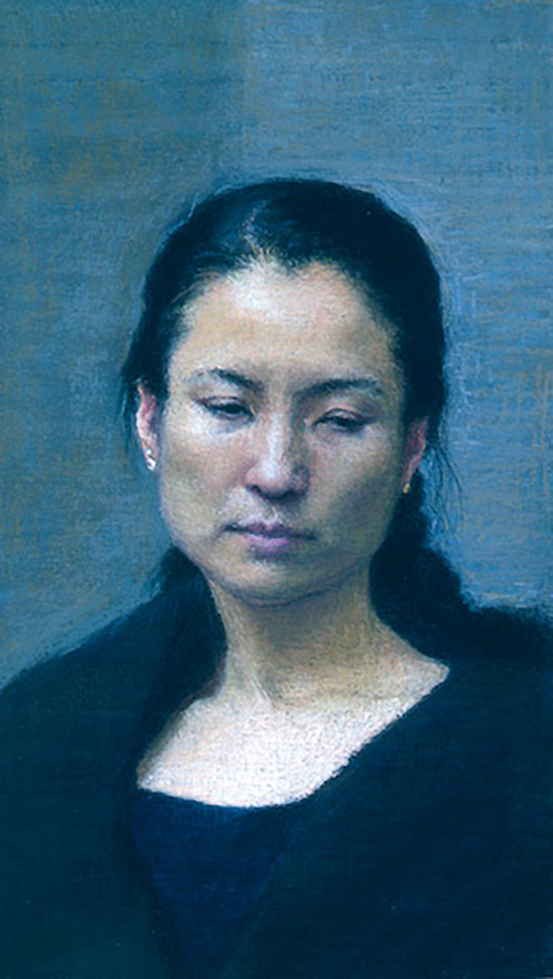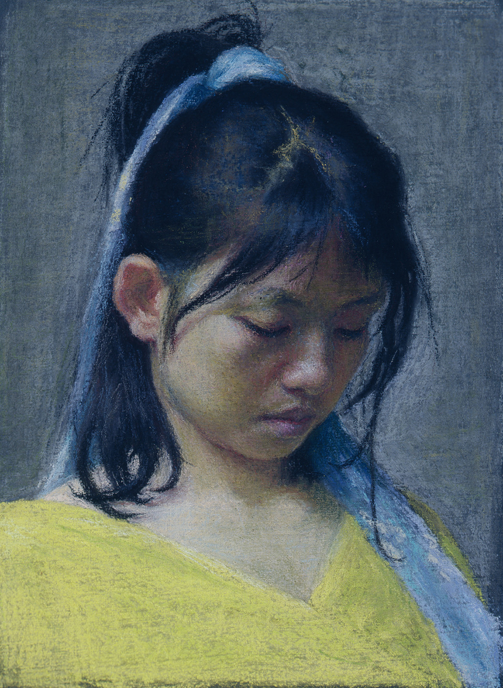 Mei-Chiao with Blue Ribbon, 8 7/8 x 6 3/4″